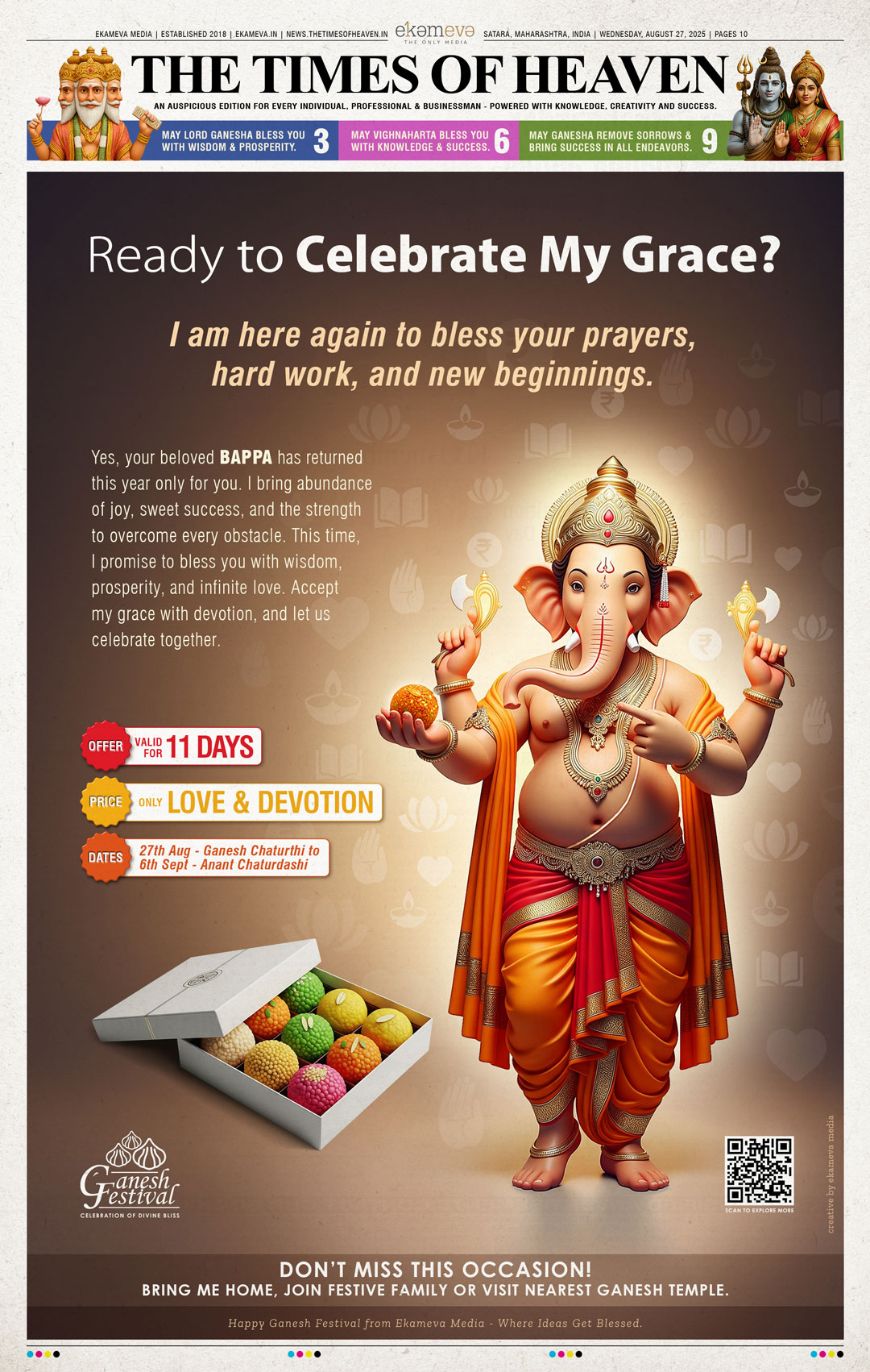 Celebrate Ganesh Chaturthi with a unique festive greeting designed by Ekameva Media. Inspired by newspaper style, this creative ad blends tradition with modern design, inviting readers to experience the festival in a new way.